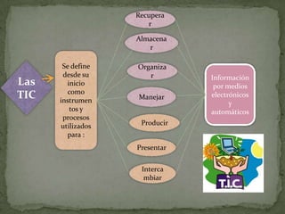 El documento describe los usos de las tecnologías de la información y la comunicación (TIC) en el proceso de enseñanza-aprendizaje. Las TIC se utilizan para organizar, almacenar, producir e intercambiar información de forma electrónica y automática. Los profesores las usan para presentar información de forma básica o más especializada, y herramientas comunes incluyen la búsqueda en línea, presentaciones, correo electrónico y herramientas específicas de cada área. El uso de las TIC mot
