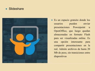 Este documento describe varias plataformas web 2.0 y 3.0 como Slideshare (para compartir presentaciones), YouTube (para compartir videos con etiquetas y contadores de visitas), Vimeo (red social para compartir y comentar videos) y Pinterest (red social para compartir y organizar imágenes en tableros por intereses).