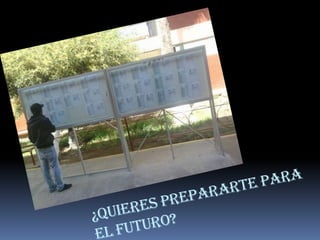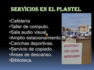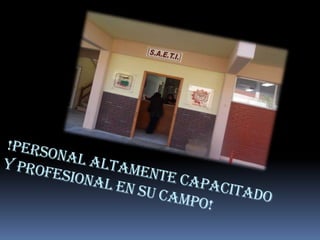 El documento presenta la escuela SAETI, incluyendo sus instalaciones como cafetería, taller de computo, sala audiovisual, estacionamiento, canchas deportivas y biblioteca. Ofrece estudiar sin dejar el empleo tomando clases los sábados y terminar el bachillerato en 6 meses con maestros capacitados y asesoría gratuita. Promete mejores puestos de trabajo y seguro de vida gratuito a los estudiantes.