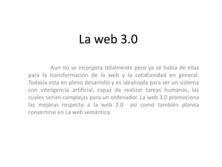 La evolución de la web ha pasado por varias etapas: la Web 1.0 permitía solo leer e intercambiar correos electrónicos de forma estática, la Web 2.0 introdujo las redes sociales y sitios como YouTube que permitieron a los usuarios crear y compartir contenido de forma dinámica, y la Web 3.0 y semántica buscan dotar a la red de inteligencia artificial para realizar búsquedas más precisas e interpretar datos de forma similar a los humanos.