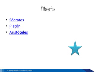 Este documento presenta información biográfica sobre tres importantes filósofos de la Antigua Grecia: Sócrates, Platón y Aristóteles. Brevemente describe que Sócrates vivió en Atenas en el siglo V a.C., que Platón nació en una familia aristocrática ateniense y fue discípulo de Sócrates, y que Aristóteles nació en Estagira en el año 384 a.C. y tuvo relación con la corte real de Macedonia.