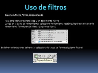 El documento describe los pasos para crear una forma personalizada en Photoshop y aplicarle diferentes filtros. Primero se crea la forma seleccionando la herramienta de forma personalizada y dibujándola. Luego se aplican filtros como Bosquejar, Esponja y Licuar para modificar la apariencia de la forma.