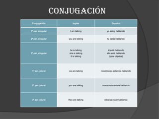 Este documento presenta la conjugación del presente continuo en inglés y español, y explica su uso y formación. Se utiliza para acciones que están ocurriendo ahora o con frecuencia, o planes de futuro. Se forma con el verbo "to be" y un gerundio ("-ing"). Existen formas afirmativas, negativas, interrogativas y respuestas cortas. Además, incluye reglas de ortografía para la formación de gerundios.