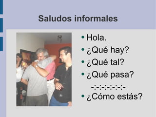 El documento presenta saludos y formas de presentarse en español. Incluye saludos informales y formales, despedidas, formas de saludarse físicamente, preguntas sobre el nombre de alguien y respuestas, ejercicios para practicar los verbos "llamarse" y "ser", y un diálogo de presentación como ejemplo.