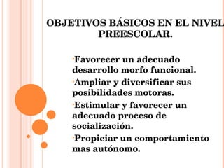 El documento presenta lineamientos para la enseñanza de la educación física en diferentes niveles educativos, incluyendo preescolar, primaria, secundaria y media básica. Detalla objetivos generales y cómo mejorar la técnica didáctica, estimular la dinámica grupal e interés de los estudiantes, y mejorar la organización de las clases. También enfatiza la importancia de que los profesores hablen con voz clara y alegre, sean pacientes y comprensivos, y realicen autoevaluaciones.