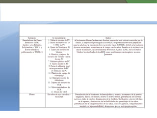El documento expone los riesgos ambientales y de salud relacionados con la fabricación y desecho de computadoras, subrayando la complejidad de los contaminantes tóxicos que contienen. Se enfatiza la necesidad de que los fabricantes asuman la responsabilidad de sus productos, promoviendo un ciclo de vida más sustentable y la implementación de legislaciones que restrinjan sustancias peligrosas. Además, se aboga por alternativas como la reutilización y el reciclaje, y se destacan iniciativas para crear computadoras más eficientes energéticamente.