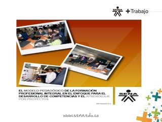 El SENA está dedicado a la formación profesional integral para el desarrollo social y económico de Colombia, con miras a convertirse en una entidad de clase mundial en 2020. Su enfoque se basa en la equidad social, integralidad, y la formación permanente, orientando el aprendizaje hacia el desarrollo de competencias laborales. Se utiliza un modelo pedagógico basado en proyectos y se valora el proceso de aprendizaje de manera cualitativa, evaluando logros y competencias de los aprendices.