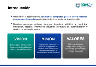 Promaut es una empresa de ingeniería que diseña y desarrolla soluciones de automatización industrial, principalmente para el sector automotriz. Su misión es proporcionar soluciones integrales desde el diseño hasta el mantenimiento, enfocándose en la innovación, la adaptabilidad y el trabajo en equipo. Promaut busca diversificar sus sectores e internacionalizar sus proyectos globales de automatización.