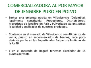 Este documento presenta una empresa colombiana que se dedica a la venta mayorista de jengibre en polvo. La empresa opera en Villavicencio y Bogotá, con 40 y 15 puntos de venta respectivamente. Además, ofrece instrucciones sobre cómo usar jengibre en polvo en recetas como alas de pollo y carne asada, e identifica algunas de sus propiedades medicinales como prevenir úlceras, problemas digestivos y actuar como energizante.