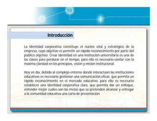 Este documento analiza los elementos de identidad corporativa presentes en la página principal del portal web de la Universidad Centroccidental Lisandro Alvarado y en las páginas de sus decanatos. El autor realiza una revisión de antecedentes teóricos sobre identidad corporativa e imagen institucional universitaria. Además, presenta los objetivos del estudio, el marco metodológico -que incluye un análisis heurístico de expertos de dichas páginas web- y las técnicas para analizar los datos recolectados. El