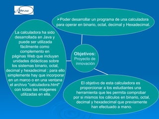 Este documento describe un prototipo de calculadora que puede operar en sistemas binarios, octales, decimales y hexadecimales. La calculadora fue desarrollada en Java y puede incorporarse fácilmente en páginas web para que los estudiantes practiquen cálculos en diferentes sistemas numéricos. El objetivo es permitir a los estudiantes verificar cálculos manuales de forma interactiva. La calculadora puede realizar operaciones básicas como suma, resta, multiplicación, división, raíces y potencias sobre enteros y decimales en los diferentes sistemas.