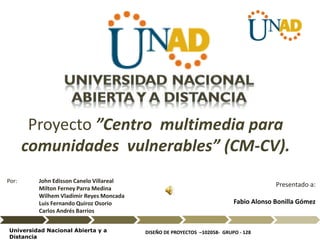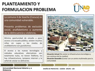 El proyecto 'Centro Multimedia para Comunidades Vulnerables' en Cazuca busca abordar el analfabetismo y la exclusión social mediante la creación de un espacio tecnológico que fomente la alfabetización y la inclusión comunitaria. Se propone desarrollar programas educativos, de integración social y de acceso a nuevas tecnologías para mejorar la calidad de vida y la participación ciudadana. La iniciativa implica la colaboración de diversas instituciones y la capacitación de la población para garantizar su sostenibilidad y efectividad.