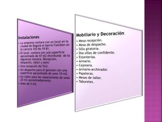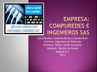 Este documento presenta una propuesta para crear una empresa llamada Compuredes e Ingenieros SAS dedicada a prestar servicios técnicos informáticos. La empresa ofrecería servicios como instalación y mantenimiento de redes, soporte técnico, actualizaciones de software y hardware. Se detallan los costos iniciales, requerimientos de personal, activos fijos y métodos para la recuperación de recursos a través de la prestación de servicios a otras empresas.