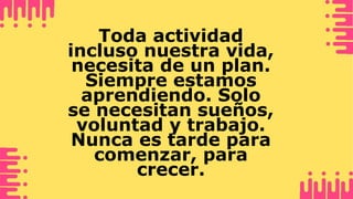 El documento proporciona información sobre cómo elaborar un proyecto de vida. Explica que un proyecto de vida representa lo que una persona quiere ser y hacer en diferentes momentos de su vida. Detalla los pasos para elaborar un proyecto de vida, como realizar un análisis DOFA, definir objetivos a corto, mediano y largo plazo, y seleccionar estrategias para cumplir los objetivos. También cubre la importancia de considerar diferentes dimensiones como la física, afectiva, laboral y espiritual al elaborar un proyecto