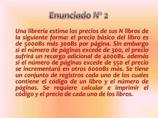 El documento describe un programa que calcula los precios de libros en una librería. La librería estima los precios basados en el número de páginas de cada libro, aplicando recargos adicionales si la cantidad de páginas supera ciertos umbrales. El programa solicita el número de libros, registra los códigos y páginas de cada libro, y calcula e imprime el código y precio de cada libro.