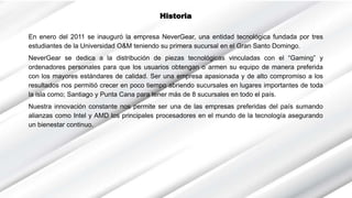 NeverGear es una empresa fundada en 2011 que se dedica a la distribución de piezas tecnológicas para gaming y ordenadores personales. La empresa ha crecido rápidamente abriendo sucursales en varias ciudades de República Dominicana. Su misión es ofrecer la mejor experiencia de compra de equipos gaming superando las expectativas de los consumidores.