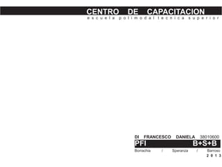 1. El documento presenta un proyecto para la creación de un centro de capacitación en el vacío de Haedo. Incluye información sobre el terreno, referencias de diseños de escuelas y el programa de necesidades para las carreras de electromecánica, química y energías renovables.
