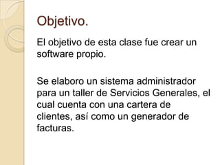 Este documento presenta el proyecto final de Programación Orientada a Objetos de José Guadalupe González Hernández. El proyecto consiste en un sistema administrador para un taller de servicios generales que incluye un generador de facturas y un almacén de información de clientes. El sistema optimiza los procesos de facturación, almacena datos de clientes y permite el acceso rápido a ellos. El diseño incluye clases, secuencias, pruebas unitarias e interfaces gráficas, y almacena datos en una base de MySQL.