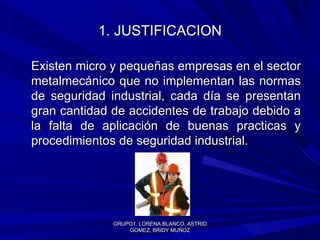 El documento propone la creación de una empresa de asesoría en seguridad industrial para micro y pequeñas empresas del sector metalmecánico en Bogotá. La empresa brindará servicios como identificar riesgos, diseñar sistemas de control, normas de seguridad e inspecciones. El proyecto busca reducir accidentes laborales en el sector a través de la capacitación y asesoría en seguridad. Se requiere una inversión inicial de $7.615.000 pesos colombianos y el proyecto estará listo para operar a partir del ter