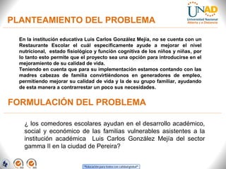 Este documento propone el diseño e implementación de un restaurante escolar en la Institución Educativa Luis Carlos González Mejía en Pereira, Colombia. El proyecto busca mejorar la nutrición y rendimiento académico de los estudiantes a través de la provisión de comidas saludables. El restaurante también generaría empleo para madres cabeza de familia. El documento incluye un análisis de la demanda, oferta, costos, y beneficios del proyecto.
