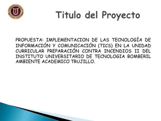 Este documento propone implementar las tecnologías de información y comunicación (TICS) en la unidad curricular Preparación Contra Incendios II del Instituto Universitario de Tecnología Bomberil para flexibilizar el horario de estudio de los participantes. Actualmente la unidad tiene 10 horas semanales y los participantes tienen dificultades para asistir. Se propone usar herramientas TIC como internet, correo electrónico y videoconferencias para desarrollar competencias de forma presencial y a distancia. Se aplicaron cuestionarios al docente y