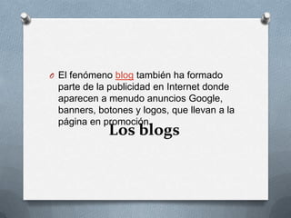 La publicidad en Internet incluye formatos como banners, videos, blogs y texto para promover productos en línea. Los banners pueden ser estáticos, animados o rotativos. Los blogs y videos también se usan comúnmente para publicidad. YouTube podría generar ingresos clasificando videos por categoría y cobrando por algunos tipos como publicidad o arte animado.