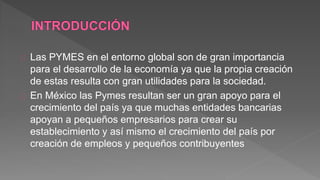 Las PYMES son pequeñas y medianas empresas que son importantes para el desarrollo económico de México porque generan empleos, contribuyentes e impulsan el crecimiento del país. Las PYMES se pueden encontrar en los sectores de servicios, comercio e industria y aunque tienen menos recursos que las grandes empresas, pueden adaptarse bien a los cambios del mercado. Es importante apoyar a las PYMES a través de financiamiento y estrategias gubernamentales para que superen limitaciones y puedan consolidarse y crecer.