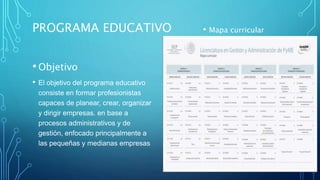 El programa educativo tiene como objetivo formar profesionistas capaces de planear, crear, organizar y dirigir empresas, enfocándose en las pequeñas y medianas empresas. El perfil del egresado incluye habilidades analíticas y gerenciales para tener una visión de negocios y competitividad, aplicando técnicas administrativas en diferentes áreas. Las pequeñas y medianas empresas son pilares financieros en México y generan la mayoría de los empleos y más del 36% del PIB.