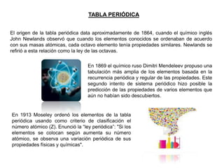 Este documento presenta una introducción a la tabla periódica, incluyendo su historia, organización, clasificación y propiedades periódicas. Explica que la tabla periódica ordena los elementos de acuerdo a su número atómico y propiedades recurrentes. Describe las características de los periodos, grupos y bloques, y cómo varían propiedades como los radios atómicos, energía de ionización y electronegatividad a través de la tabla.