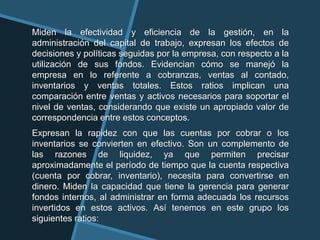 Los ratios de gestión miden la efectividad y eficiencia en la administración del capital de trabajo y expresan el efecto de las decisiones empresariales sobre la utilización de recursos. Algunos ratios clave son: el período de cobranzas, que cuantifica el tiempo para convertir cuentas por cobrar en efectivo; la rotación de inventarios, que mide el tiempo para convertir inventarios en efectivo; y el período promedio de pago a proveedores, que indica el tiempo para pagar deudas.