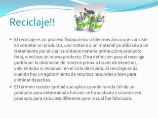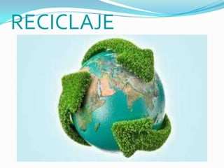 El documento habla sobre el reciclaje. Explica que el reciclaje es un proceso para obtener materia prima a través de desechos y volverlos a introducir en el ciclo de vida. También describe los diferentes tipos de plásticos que se pueden reciclar como PET, HDPE, PVC, entre otros. Finalmente, concluye que el reciclaje es importante para reducir los desechos, ahorrar recursos y energía, y disminuir la contaminación.