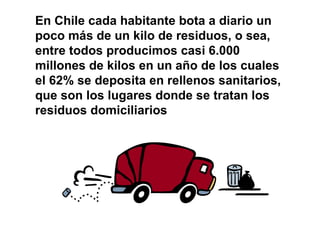 El documento habla sobre la gestión de residuos domésticos en Chile. Explica que cada persona produce alrededor de 1 kg de basura al día y que la mitad son residuos orgánicos mientras que la otra mitad es papel, plástico y otros materiales. Recomienda las tres erres de reducir, reutilizar y reciclar para disminuir la cantidad de desechos. Resalta la importancia de separar los materiales biodegradables de los no biodegradables y reciclar el papel, vidrio, plásticos y metales.