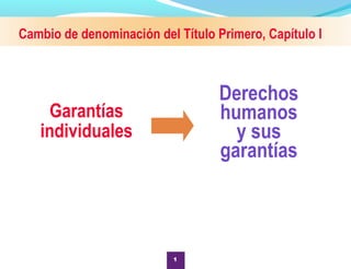 Este documento resume los principales cambios introducidos a la Constitución Mexicana en materia de derechos humanos a través de varias reformas. Entre los cambios se encuentran: reconocer expresamente los derechos humanos y su interpretación conforme a los tratados internacionales; establecer obligaciones estatales como prevenir, investigar y reparar violaciones; e incluir la prohibición de discriminación por preferencias sexuales. Asimismo, las sentencias de la Corte Interamericana de Derechos Humanos son vinculantes para México cuando es parte del litig