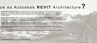 Este documento presenta una introducción y tutorial básico sobre el uso del software de modelado arquitectónico Autodesk Revit Architecture 2011. Explica conceptos clave como la interfaz, la creación de elementos de masa conceptuales, niveles y el navegador de proyectos. Además, describe las principales herramientas y funciones para generar y editar formas tridimensionales y volúmenes.