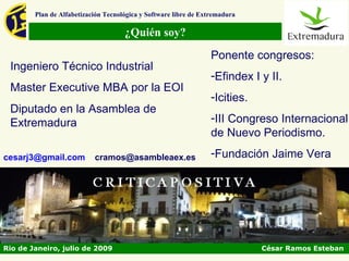 El documento presenta un plan de alfabetización tecnológica y software libre para la región de Extremadura en España. El plan tiene como objetivos garantizar la alfabetización tecnológica de todos los ciudadanos y lograr la conectividad en todos los municipios, a través de la creación de nuevos centros de conocimiento y el uso de software libre en la educación y la administración pública. El plan también promueve la cooperación internacional en materia de TIC con países de América Latina.