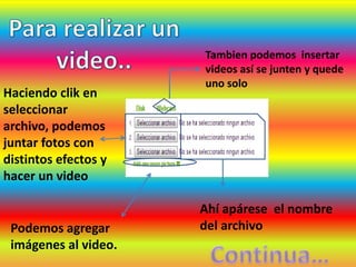 Este documento proporciona instrucciones sobre cómo unir múltiples imágenes en un solo video utilizando una herramienta en línea. Explica los pasos de seleccionar archivos, elegir efectos y velocidad, iniciar el proceso de unión, y luego compartir o publicar el video resultante.