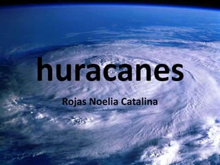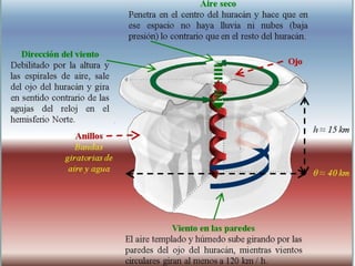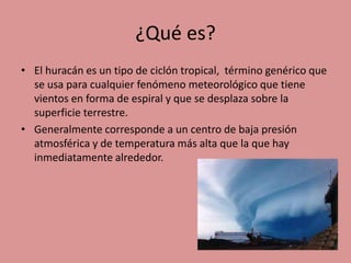 El huracán es un ciclón tropical que se forma sobre aguas cálidas y se caracteriza por tener vientos en espiral, un centro más cálido que el aire circundante, y se alimenta de la energía liberada por la condensación del vapor de agua. Presenta una estructura con vientos ascendentes en el centro que forman grandes nubes, lluvia y vientos giratorios de diferentes direcciones en función de la altitud. Su observación se realiza de forma directa mediante aviones, barcos o boyas, y de forma indirecta a través de satél