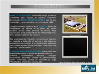 1) El documento describe el sistema constructivo Royal Building System, fabricado con piezas de PVC en Argentina desde 1994.