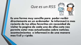 RSS es una forma de recibir actualizaciones de sitios web favoritos de manera automática y sin necesidad de visitar cada sitio. Los lectores RSS permiten acceder a esta información reciente de manera centralizada desde el ordenador, páginas web o correo electrónico. Existen diferentes tipos de lectores RSS como programas de escritorio, servicios en línea o extensiones de navegadores y correo.