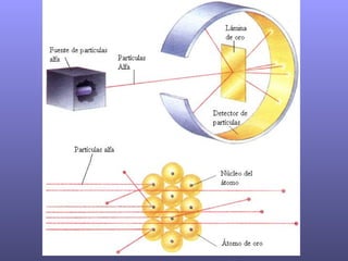 El experimento de Rutherford consistió en disparar partículas alfa contra una fina lámina de oro y observar su trayectoria. Rutherford concluyó que la mayoría de las partículas atravesaban la lámina, indicando que el átomo está mayormente vacío, y que algunas rebotaban, mostrando la existencia de un núcleo denso y positivamente cargado. Esto llevó a Rutherford a proponer un modelo atómico con electrones orbitando un núcleo central que concentraba casi toda la masa del átomo.