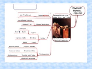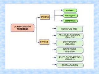 La Revolución Francesa estalló en 1789 debido a las ideas ilustradas, los problemas sociales como la oposición de los privilegiados y la crisis financiera. La Asamblea Nacional abolió el sistema feudal y elaboró la Declaración de Derechos Humanos. Más tarde se estableció una monarquía constitucional, pero la familia real intentó huir. Esto llevó al establecimiento de la Primera República Francesa y la ejecución del rey Luis XVI. Napoleón llegó al poder a través de un golpe de estado en
