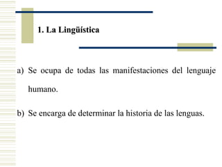 El documento describe las contribuciones de Ferdinand de Saussure a la lingüística. Saussure introdujo importantes distinciones como la diferencia entre lengua (langue) y habla (parole), y concepto de signo lingüístico compuesto por el significante y el significado. También destacó la naturaleza arbitraria del signo lingüístico. Sus ideas influyeron en las Escuelas de Ginebra y Praga. La Escuela de Praga, en particular, desarrolló conceptos como el fonema y la doble articulación.