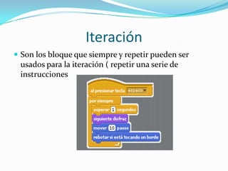 El documento presenta información sobre Daniel Steven Hernández Zárate y su profesor John Alexander Caraballo Acosta, incluyendo sus nombres, correos electrónicos y blogs. Luego describe cómo la iteración permite repetir bloques de instrucciones, dando ejemplos de usarla para cambiar el disfraz de un murciélago o una pelota cada segundo y moverlos 10 pasos.