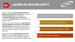 Este documento presenta a Secure Soft, una compañía de ciberseguridad con más de 13 años de experiencia y presencia en Perú, Ecuador y Bolivia. Secure Soft ofrece soluciones de seguridad de la información como monitoreo de seguridad las 24 horas, análisis de vulnerabilidades, pruebas de penetración, y cuenta con ingenieros certificados y centros de operaciones de seguridad con certificaciones ISO. Entre sus clientes se encuentran bancos, operadoras de telecomunicaciones y otras grandes empresas en Perú y Ecuador.