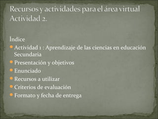 Este documento presenta una actividad evaluable para un módulo avanzado de capacitación para la docencia en línea. La actividad se enfoca en el aprendizaje de las ciencias en educación secundaria y requiere que los profesores analicen sus concepciones sobre la enseñanza de la ciencia, identifiquen las ideas previas de los estudiantes, y planifiquen una estrategia didáctica centrada en el aprendizaje del estudiante.
