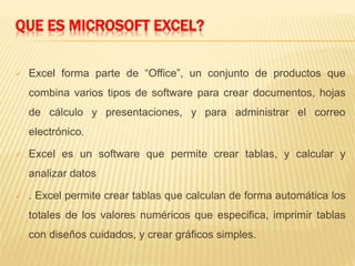 Este documento describe las funcionalidades básicas de Microsoft Excel. Excel es un software de hoja de cálculo que permite crear tablas, calcular y analizar datos numéricos de forma automática, e incluso imprimir tablas y crear gráficos simples. Aunque su propósito principal es el cálculo, algunos usuarios también lo usan para crear documentos aprovechando sus características de diseño de tablas. El documento explica cómo iniciar Excel, personalizar la barra de herramientas, trabajar con hojas, filas y columnas