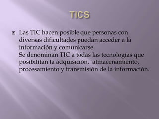 Este documento describe varias tecnologías de la información y la comunicación (TIC) que pueden usarse para ayudar a personas con discapacidades. Estas incluyen manos biónicas, dispositivos de movilidad personal, líneas Braille, emuladores de mouse, teclados virtuales, lectores de pantalla y herramientas de software para el desarrollo del lenguaje. El documento concluye recomendando capacitar a docentes sobre estas herramientas y llevarlas a las aulas para potenciar las habilidades de los estudiant