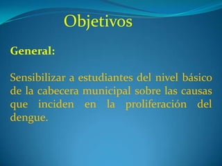 El documento describe un proyecto para sensibilizar a estudiantes sobre las causas y prevención del dengue en Melchor de Mencos, Petén. Los objetivos son capacitar a estudiantes sobre prevención del dengue y proveer información sobre medidas preventivas. El proyecto se implementará en escuelas de la cabecera municipal y beneficiará indirectamente a 17,821 personas. Se investigaron las fuentes del problema, como la falta de información y control sanitario. El presupuesto fue de Q5010.00.
