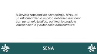 El documento proporciona información sobre el Servicio Nacional de Aprendizaje (SENA) de Colombia. SENA es un establecimiento público que ofrece formación profesional integral a los trabajadores colombianos para contribuir al desarrollo social y económico del país. El documento describe la misión, visión, logotipo, himno y servicios de bienestar de SENA. También explica el papel de los aprendices y tutores, y menciona que SENA usa las plataformas Blackboard y Sofía Plus para gestionar la formación