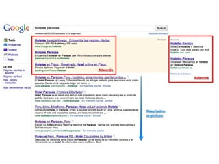 Este documento presenta información sobre publicidad en línea y posicionamiento web (SEO). Explica el proceso de búsqueda de los usuarios y factores importantes para optimizar una página web como títulos, metadescripciones, enlaces y contenido. También cubre Google AdWords como una herramienta de marketing en buscadores mediante el pago por clic.